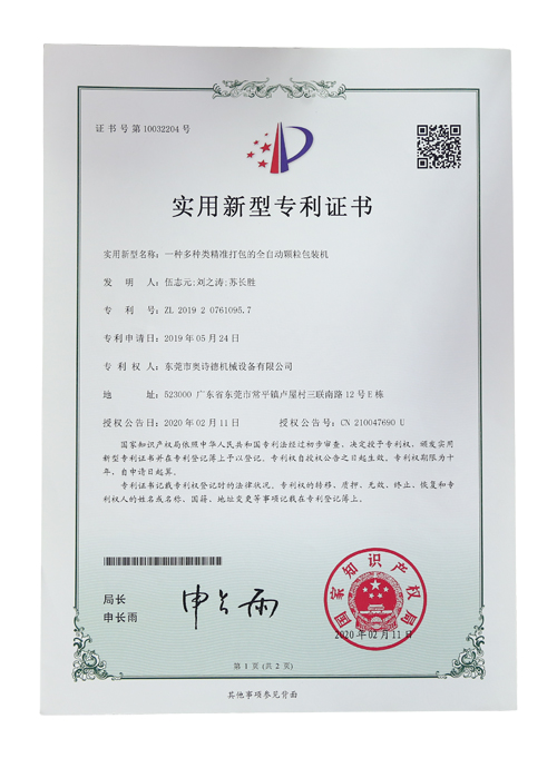 一種多種類精準(zhǔn)打包的全自動(dòng)顆粒包裝機(jī)專利證書